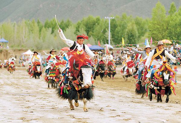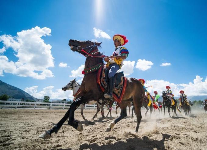 另外,西藏地区气候高寒,地势开阔,高山草甸、高原宽谷等草场资源丰富,适合畜牧业生产。藏族人在长期的放牧过程中,总结出了具有自己民族特色的牧谚,如“春季牧场在山腰,夏季牧场在平坡,秋季牧场在山顶,冬季牧场在阳坡”,“春放水边,夏放山,秋放山坡,冬放滩”,等等。对那里的人们来说,生产生活离不开马匹,骑马和放牧是基本的生存技能,马是牧民日常生活中最亲密的伙伴。西藏牧民长期以来过着逐水草而居的游牧生活,今天,在党的富民政策指引下,农牧交错区的藏族同胞基本实现定居,但在牧区仍然处于半定居状态,他们的传统体育项目中与马有关的相当多。其中以当雄赛马节和康定赛马节最具盛名。赛马已成为藏族最持久、最普遍的群众性体育活动。赛马节中的比赛内容也日渐丰富,具体有马上射箭、打靶、短道冲刺、马上拾哈达、马上献青稞酒等与马有关的项目。可见,原本仅仅作为生存方式的骑马、牧马已经衍生成为独具藏族特色的民族体育项目,并形成了藏族世俗文化最为重要的组成部分——赛马文化。