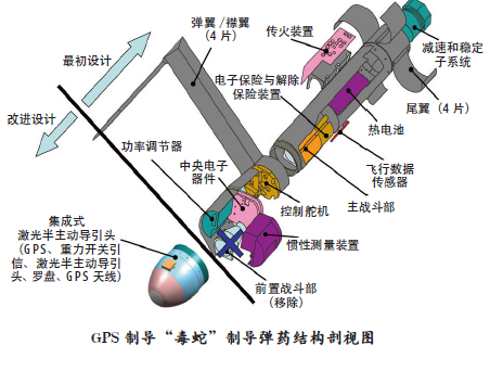 “毒蛇”子弹药引入了GPS制导,子弹药的射程增加,可防区外远距离攻击目标。另外,“毒蛇”子弹药还将加装数据链,具备对付移动目标和同时攻击多个目标的能力。据称,“毒蛇”子弹药还有可能采用红外/ 毫米波复合导引头。