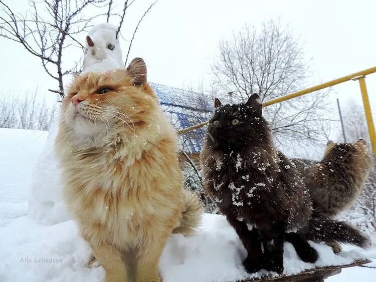 因为西伯利亚猫能够忍受冰天雪地,因此莱贝德娃的猫都在户外生活。它们有防水又细密的三层毛皮,颈部有一圈毛领子,尾巴上的毛同样浓密,可以围裹面部或爪子以保温。