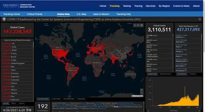这个网站是约翰霍普金斯大学的,该大学算是美国顶级的医学院了。但是你可能不知道,这个网站其实不是医学院搞得,而是土木和系统工程系搞得。哈哈哈,这就有点意思了!