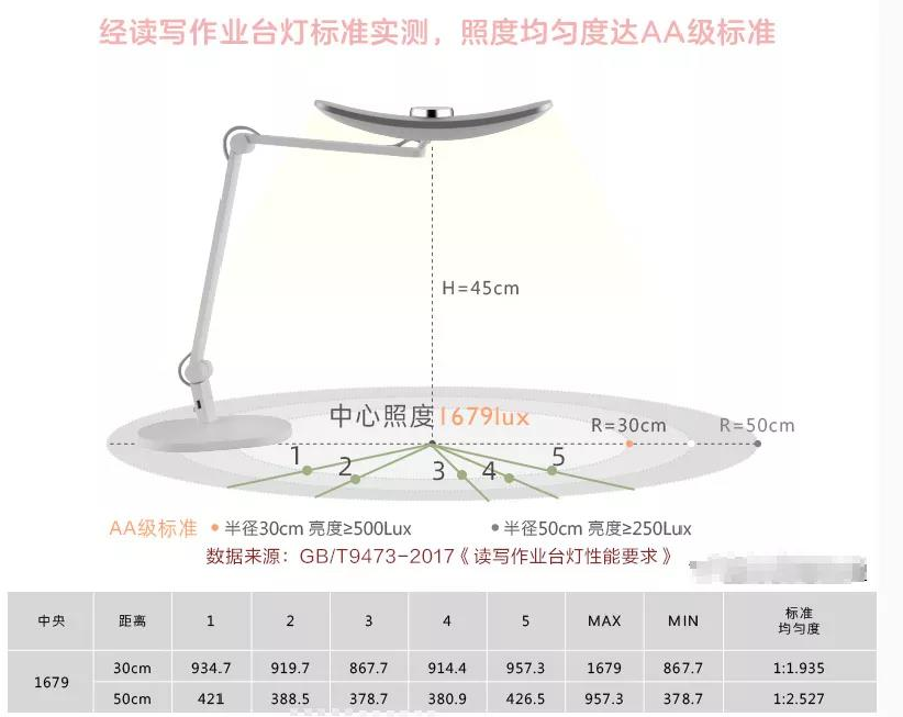 在国标GB/T 9473-2017 《读写作业台灯性能要求》中,明确了台灯照度和照度均匀度的标准: