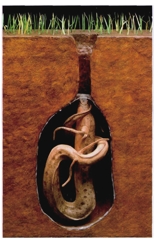 夏季的非洲大陆,高温和干旱给水中的一般鱼类带来了灭顶之灾,但肺鱼演化出了“夏眠”的奇特功能,成功躲过了灾难。肺鱼在枯水期钻进淤泥中,用嘴挖凿出一个小洞,身体分泌的粘液与洞壁泥土粘合在一起,形成封闭的泥洞,身体缩蜷在洞中,只在口前方留一个供肺呼吸的小透气孔,使肺鱼度过长达6个月的干旱期[4]。有实验证明,“夏眠”时肺鱼新陈代谢率只有大约不到正常的2%,最长可以度过3~5年的时间,只要有足够的水分就能唤醒它们。“夏眠”是肺鱼适应恶劣环境特有的方式。