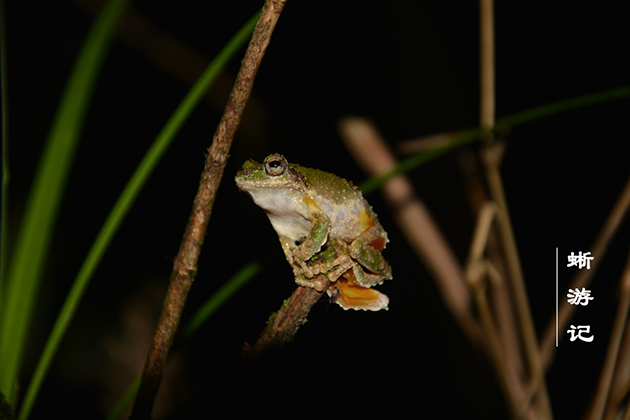 图2雄性锯腿原指树蛙竖在树枝上求偶