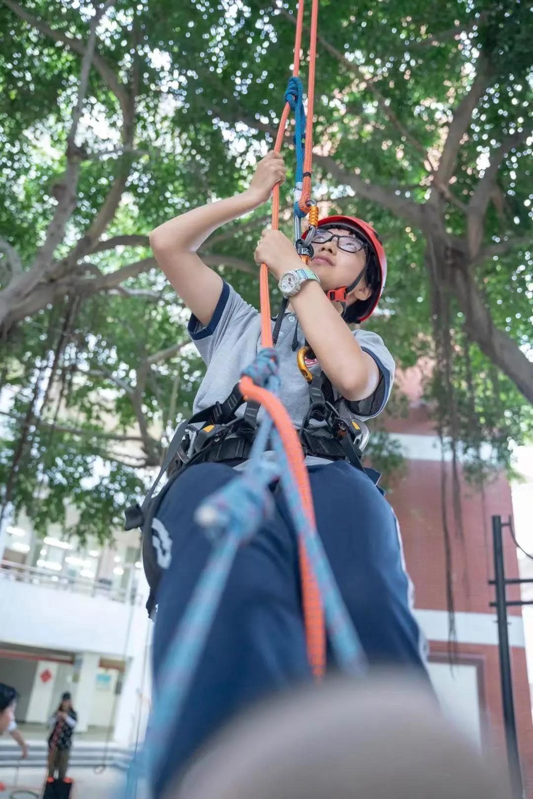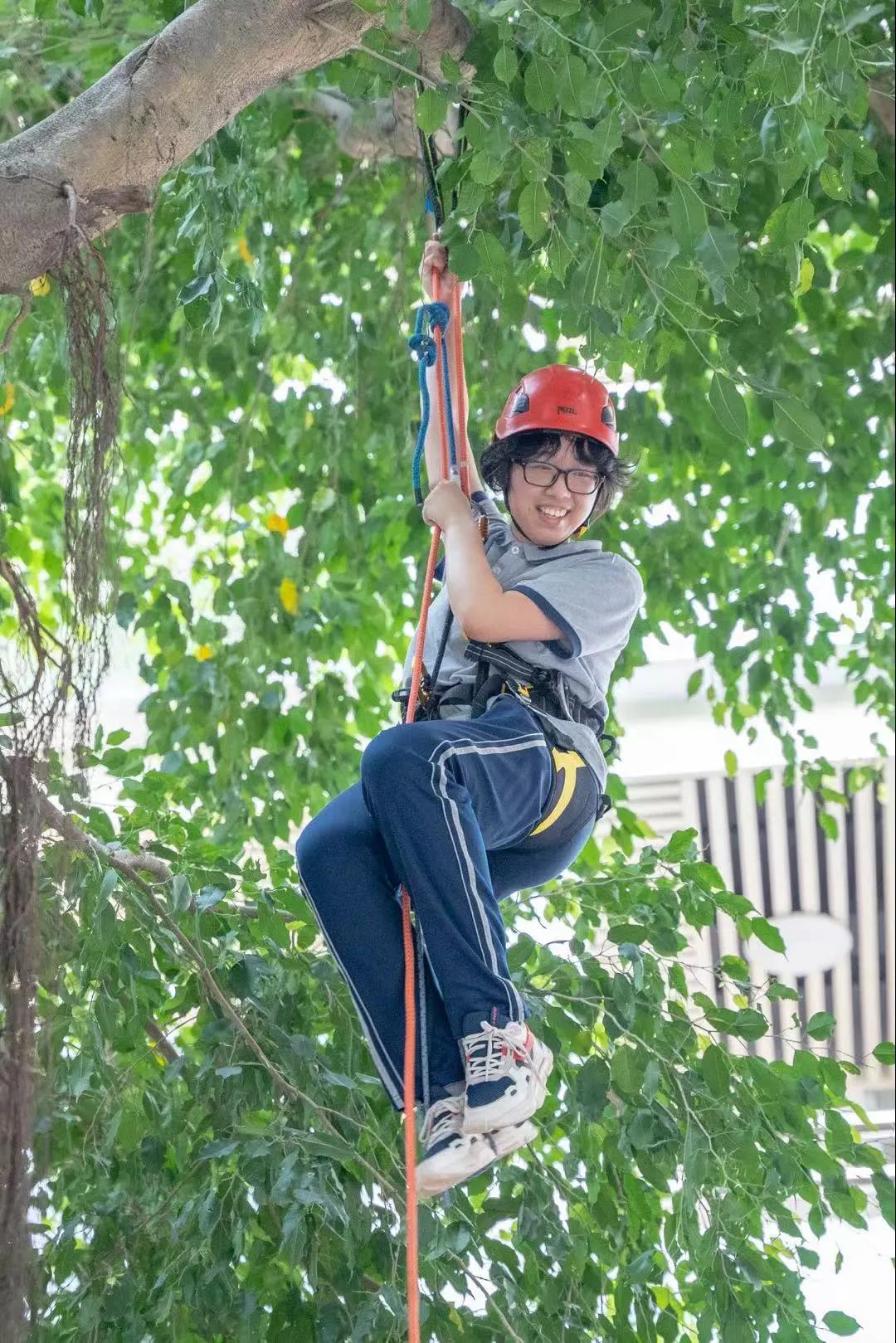 “攀树真的很难但是‘针不戳’!”几名同学在成功着陆后讨论道。尽管每个同学的爬升高度不一,但在过程中,我们观察到每个人都在专注的思考,默默的坚持,即使汗湿了衣背,双手也因为与绳子的不断摩擦出现破皮的迹象,他们的眼神仍充满坚毅的望向最高点,不断地向上、向上。