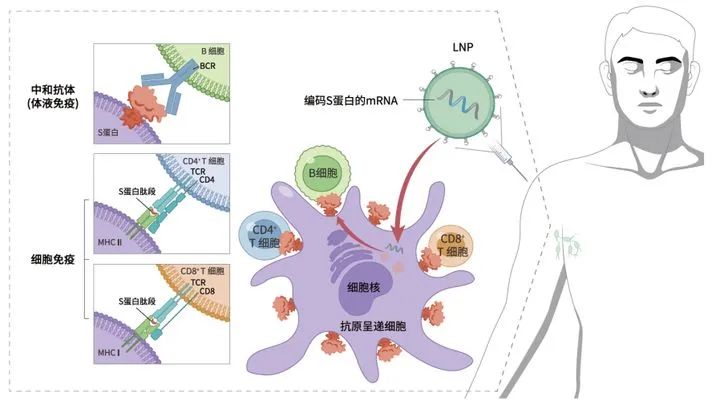 当mRNA疫苗进入体内后,释放mRNA,这可是细胞中最常见的成分之一,然后利用细胞中已有的各种酶对其进行翻译,从而合成新冠的S蛋白抗原,于是就开始激发机体的免疫。