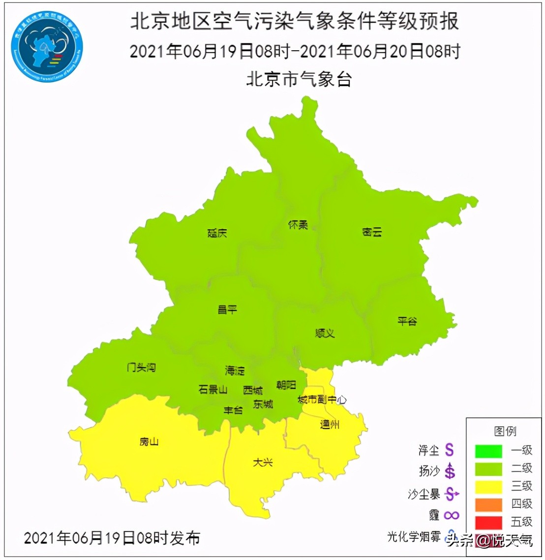今天白天:北京地区偏北风力较大,非常有利于污染物扩散,但气温高,日照强,对臭氧生成有利,综合来看空气污染气象条件等级 为 2~3 级。
