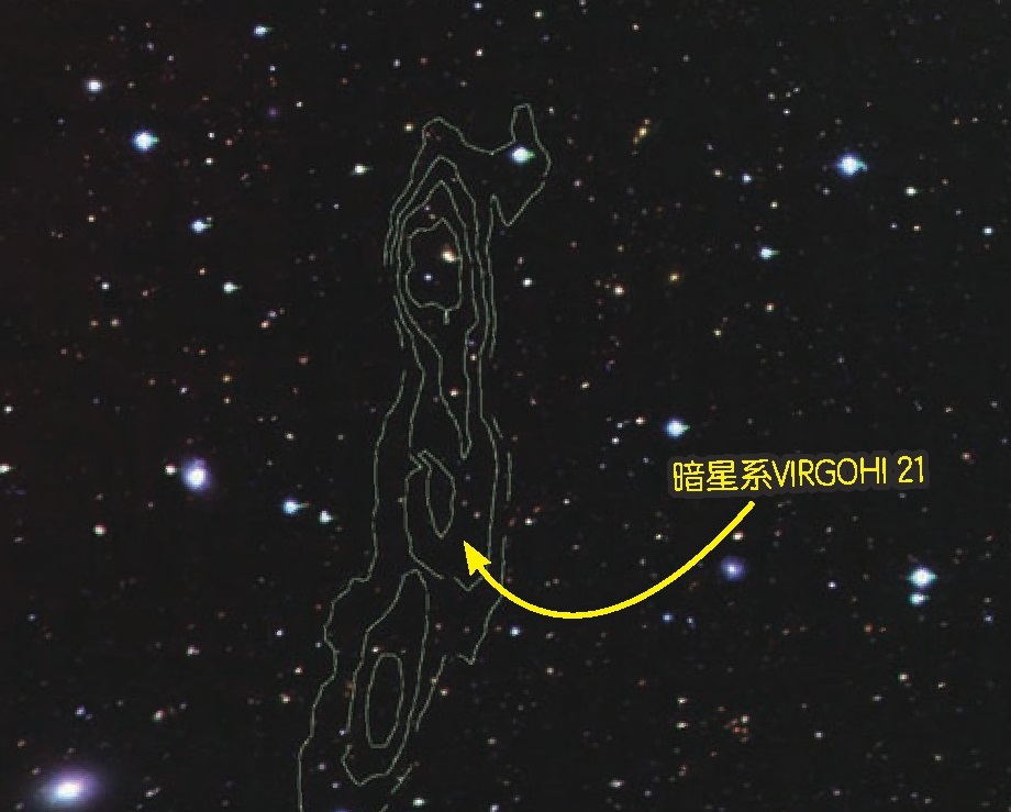 2007年,科学家们在观测室女座星系群时,偶然发现了一个十分奇怪的区域。这个名叫VIRGOHI 21的区域看似一片虚空,却对周围的星系有很强的引力作用。后来,科学家们通过精确测量这一区域中的物质质量分布,惊讶地发现:VIRGOHI 21的质量虽然和普通星系类似(约为太阳的1 000亿倍),但却是一个完全由暗物质构成的暗星系,其中不存在任何恒星或行星,也没有任何可以构成可见天体的普通物质。