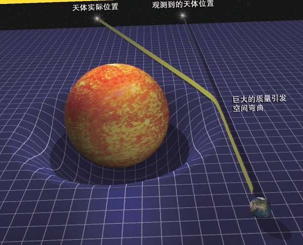 那么科学家们如何观测宇宙中的暗物质对普通物质的影响呢?这就要说到“引力透镜法”了。伟大的科学家爱因斯坦告诉我们:物质可以使时空弯曲,并且物质的质量越大,时空弯曲的程度就越大。时空弯曲了,在时空中穿梭的光线反应当然最明显,本应直线行走的光线发生了偏折,于是人们将弯曲的时空比喻为日常生活中同样能使光线偏折的“透镜”,并将这种时空弯曲使光线偏折的现象称为“引力透镜效应”。