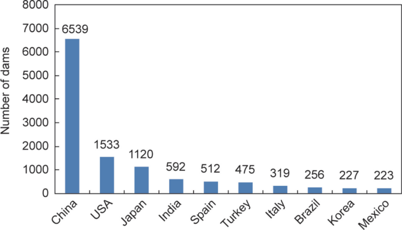 截至2014年,中国建成各类水库9.8万多座,超30m高的大坝6539座,占世界总数的43%,并提供了6.9×107 hm2的有效农业灌溉面积(占全球的23%)与3×108kW的水电总装机容量(占全球的27%)。当前中国已成为世界上水库大坝数量最多、农田灌溉面积最大、水电总装机容量最大、调水工程里程最长的国家。