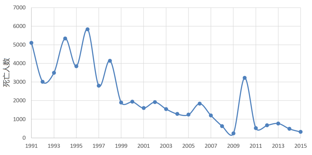 1991-2015年间我国洪涝死亡人数(2010数据含舟曲泥石流)。