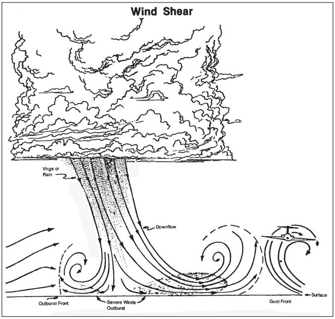 a.强对流天气。通常指雷暴、积雨云等天气。在这种天气条件影响下的一定空间范围内,均可产生较强的风切变。尤其是在雷暴云体中的强烈下降气流区和积雨云的前缘阵风锋区更为严重。对于特别强的下降气流称为微下冲气流,是对飞行危害最大的一种。它是以垂直风为主要特征的综合风切变区。