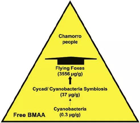 蝙蝠和Guam-ALS-PDC又有什么关系呢?答案的关键在一个并不陌生的现象:生物富集。动物需要很多食物来长自己的肉(比如大鱼可能要吃十斤小鱼才能长一斤肉,而小鱼要吃十斤水蚤才能长一斤肉),所以食物里原本很少的毒素,可能会在动物体内积存很多。在生态金字塔上位置越高,动物体内富集的毒素越多,受到毒害的风险也越大。