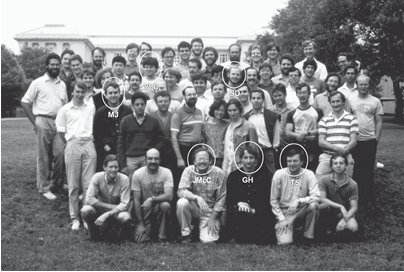 照片中标出的是斯坦尼斯拉斯·德阿纳(SD)、迈克尔·乔丹(MJ)、杰伊·麦克莱兰德(JMcC)、杰弗里·辛顿(GH)、特伦斯·谢诺夫斯基(TS)和我(YLC)。除此之外,照片上的许多参与者日后都成了机器学习、人工智能和认知科学领域的重要人物:安迪·巴尔托、戴夫·图尔茨基、格里·泰绍罗、乔丹·波拉克、吉姆·亨德勒、迈克尔·莫泽尔、理查德·德宾等组织者。