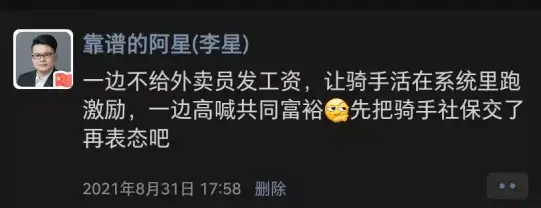 今年7月份市场监管总局等七部门联合印发了《关于落实网络餐饮平台责任切实维护送餐员权益的指导意见》,其中就着重提出了完善骑手的社会保障水平;而美团市值在该指导意见出台之后狂跌掉了上千亿元。