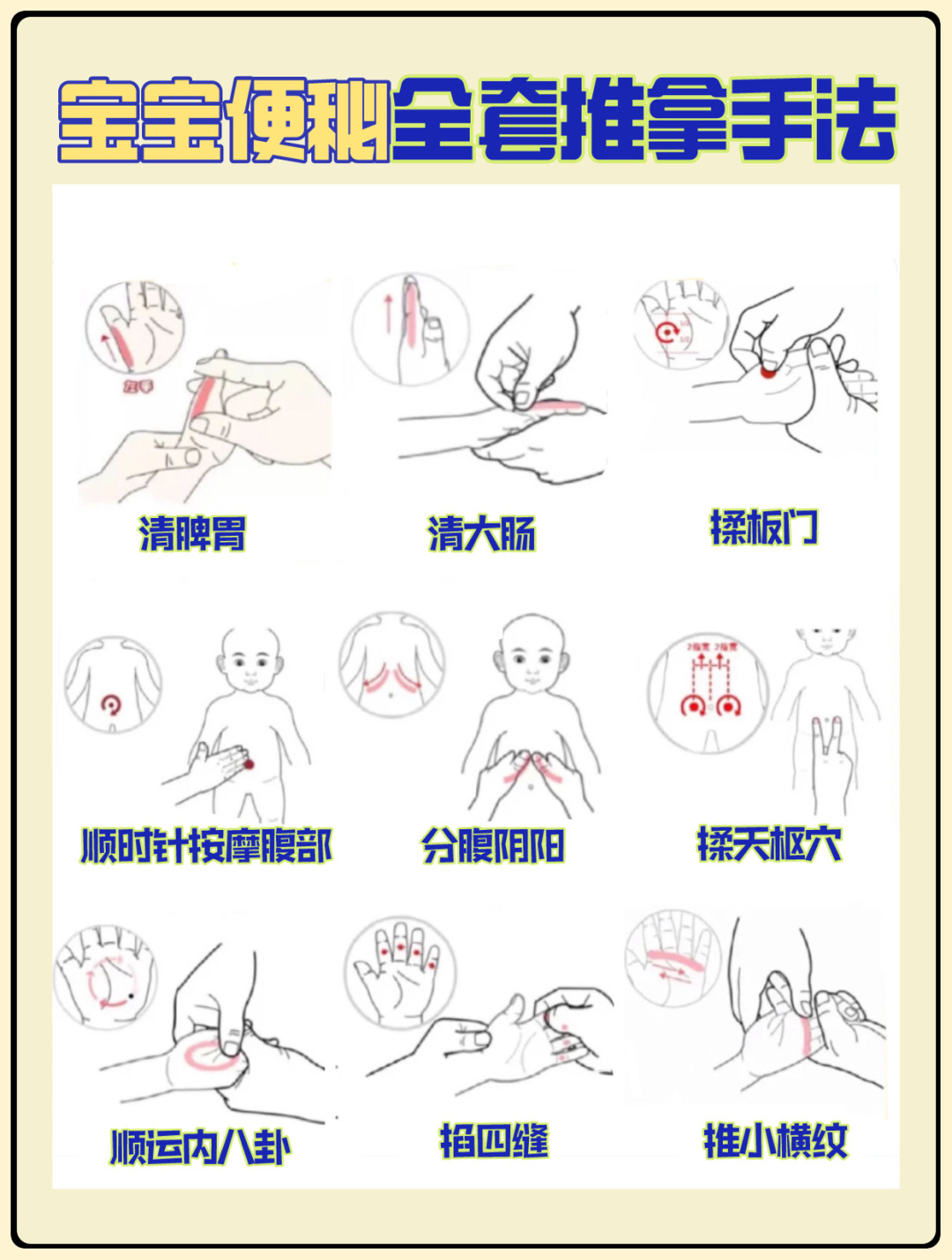 在宝宝吃完东西后半个小时,妈妈可以用一只手的掌心贴在肚脐附近,另一手叠上上面,顺时针方向轻揉宝宝的腹部。来帮助宝宝蠕动。