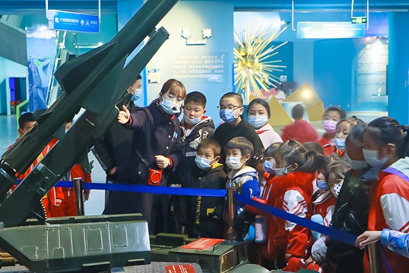 进入科技馆,孩子们被眼前众多的科技信息所震撼。绵阳科技馆共设展项148个,以“两弹一星”为主题,核科技为主线,分导弹展区、航空航天展区、卫星与信息展区、核武器与核科技展区、卫星与空间信息技术、科技绵阳五大板块。讲解老师带领着孩子们从一楼中国导弹历程与经典导弹模型讲起,到介绍二楼核武器与核科技区,再到三楼中国核武器发展历程,孩子们无不惊叹,既感慨科学技术的奥妙无穷,又赞叹历史上为科技献身的伟人们。当参观至载人火箭内空间时,孩子们十分好奇,迫不及待的往里钻,不少孩子驻足停留直至队伍离开。