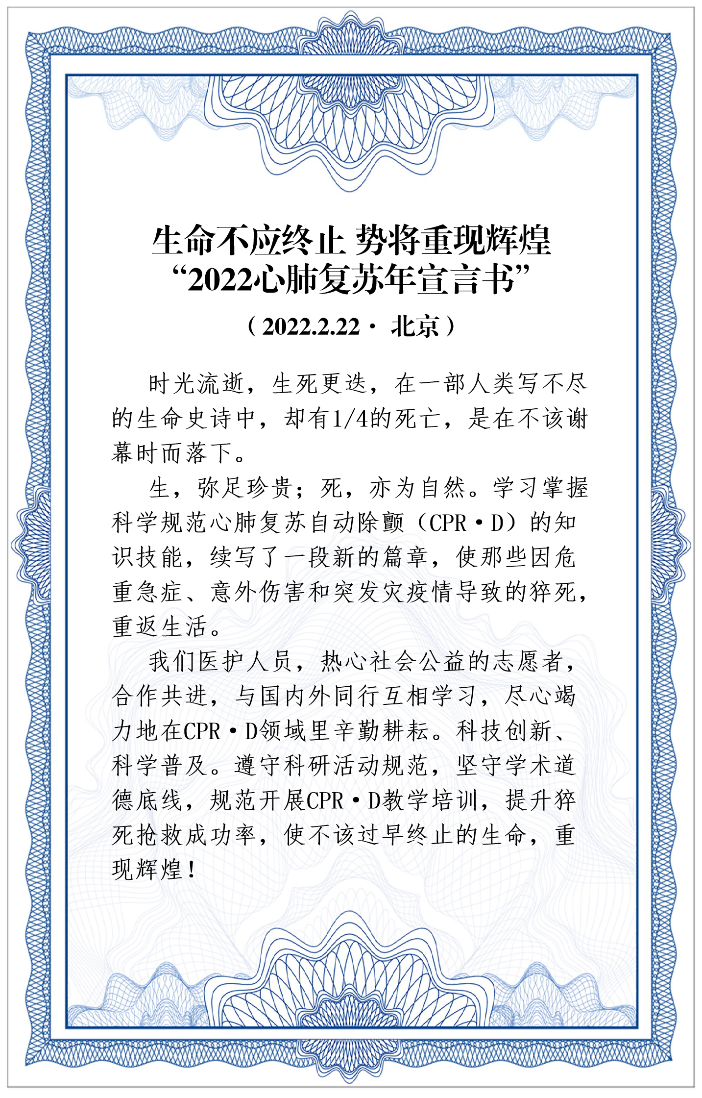 《生命不应终止,势将重现辉煌——2022心肺复苏年宣言书》全文如下: