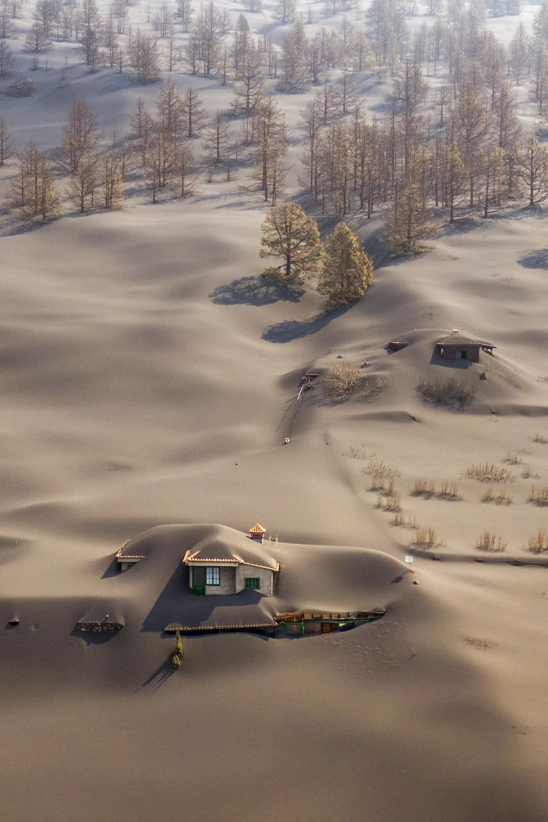 (2021年10月30日,西班牙拉帕玛火山喷发后,被火山灰掩埋的房屋和村庄,仅作示意,图片来源@视觉中国)