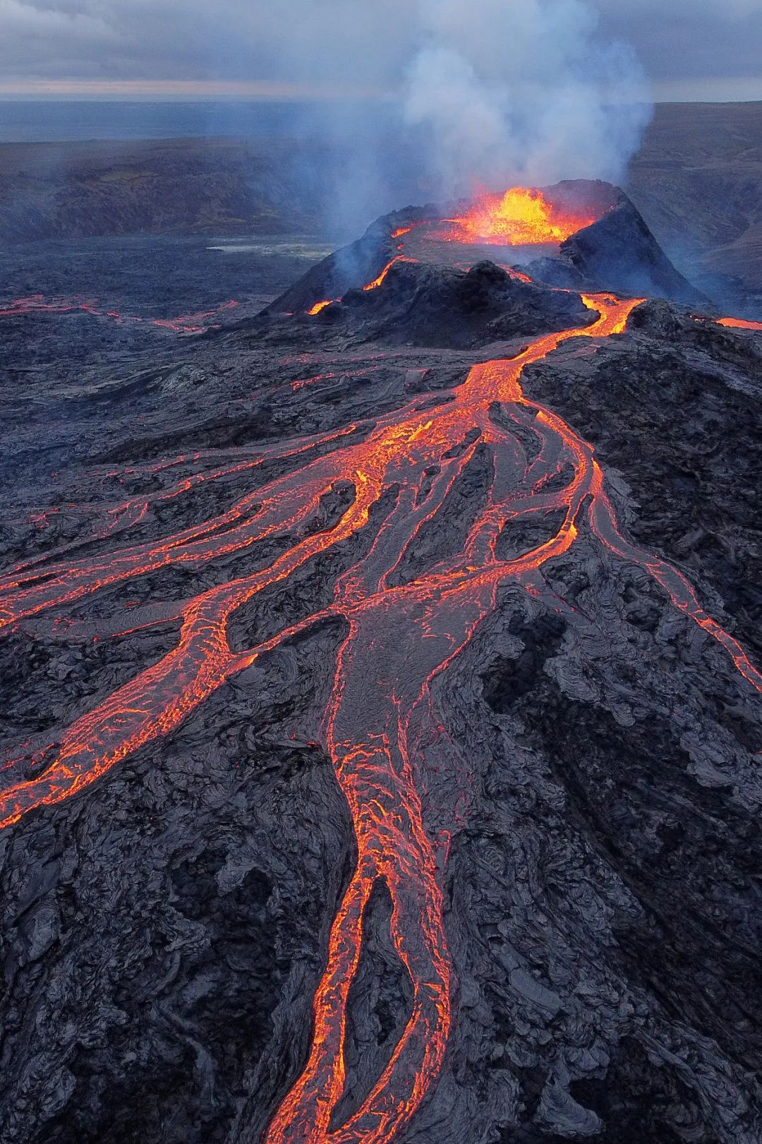 (2021年冰岛格尔丁戈火山喷发时的熔岩喷泉和熔岩流,是典型的低粘度岩浆喷发的场景,仅作参考,图片来源@视觉中国)