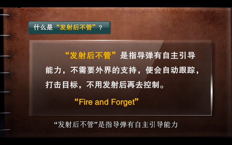各位好!精确制导系列微课来了。上节课,我讲了英阿马岛战争“飞鱼”导弹击沉“谢菲尔德”号巨舰的战例。这节课,我将通过介绍制导系统的组成及其工作原理,并重点剖析寻的制导方式,来逐步揭开“发射后不管”背后的奥秘。首先我简要说说“发射后不管”的定义。