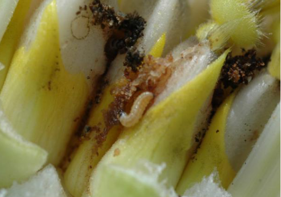 向日葵螟之所以能对向日葵造成危害,主要是因为其雌蛾能够将卵产在向日葵的筒状花内,初孵幼虫取食筒状花,之后蛀入籽粒,取食籽仁及花盘组织,从而造成损失。