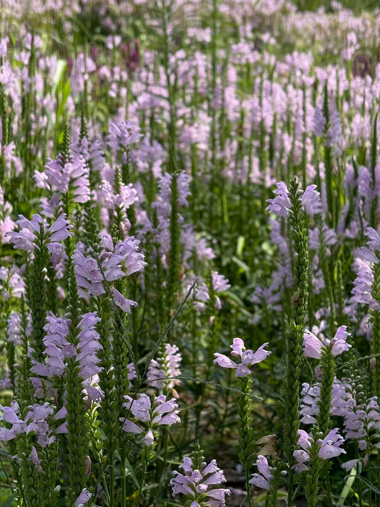 假龙头花(Physostegia virginiana),是唇形科假龙头花属植物,多年生宿根草本,株高60~120cm,茎四方形、丛生而直立,单叶对生,披针形,亮绿色,边缘具锯齿,穗状花序顶生,长20~30cm;每轮有花2朵,花冠唇形,花筒长约2.5cm,唇瓣短,花色淡紫红。