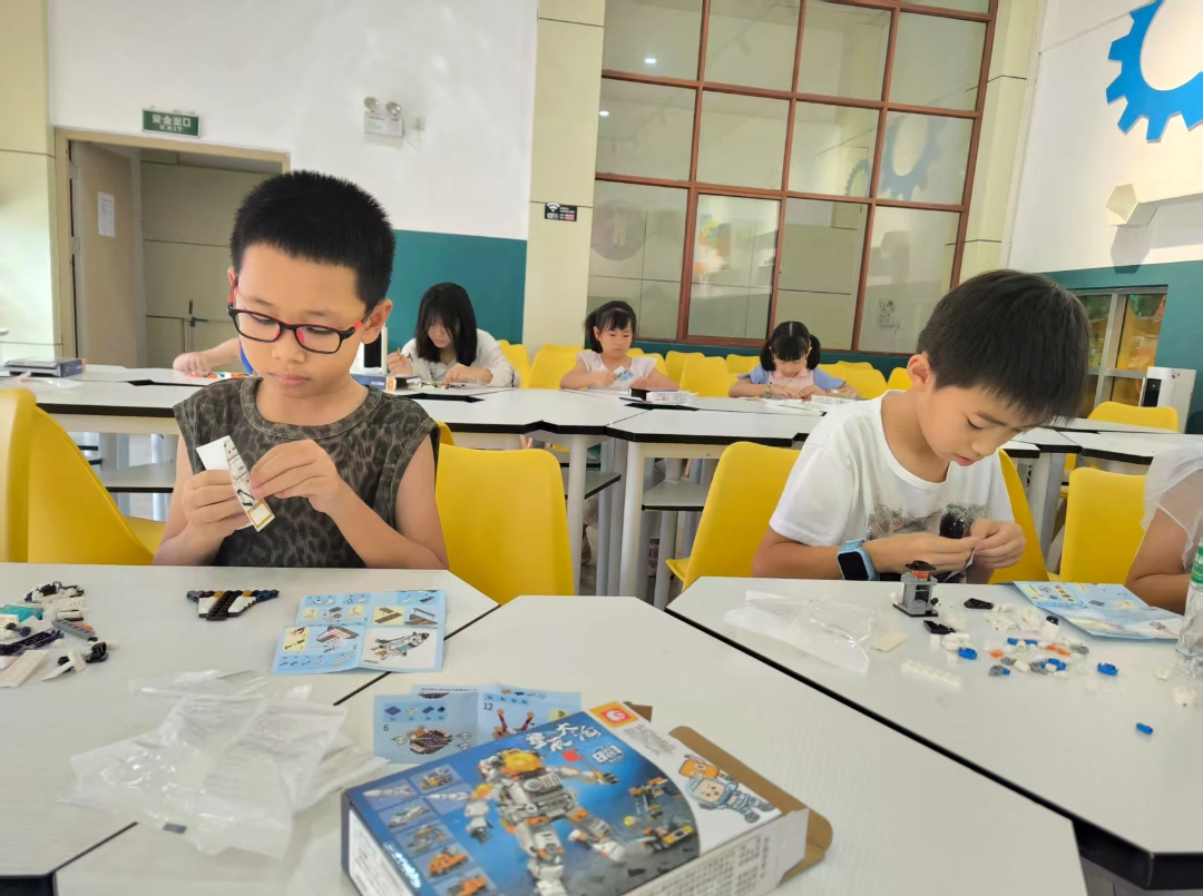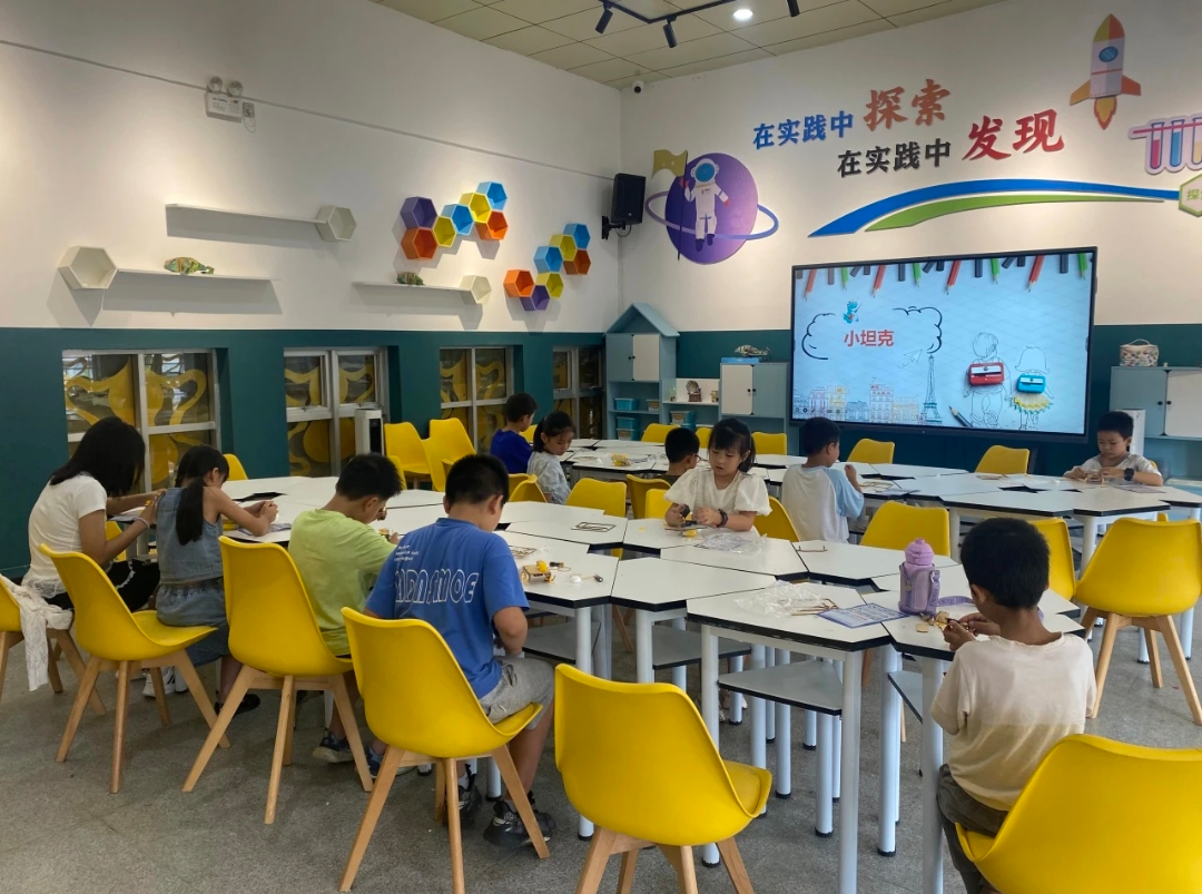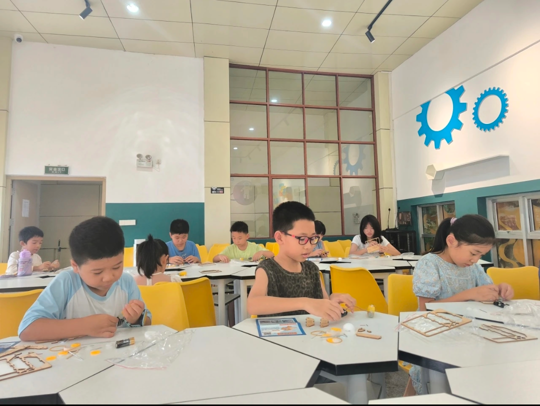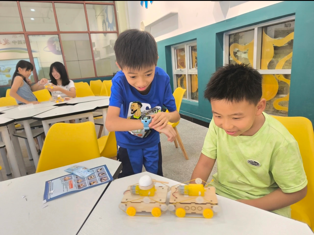 8月10日周日小坦克制作人气高。用马达、电池盒、带凹槽的轮子,以橡皮筋串联轮子形成“履带”。孩子们在辅导员指导下固定零件、卡紧橡皮筋,当坦克“咯噔”开动时,满是惊喜欢呼。