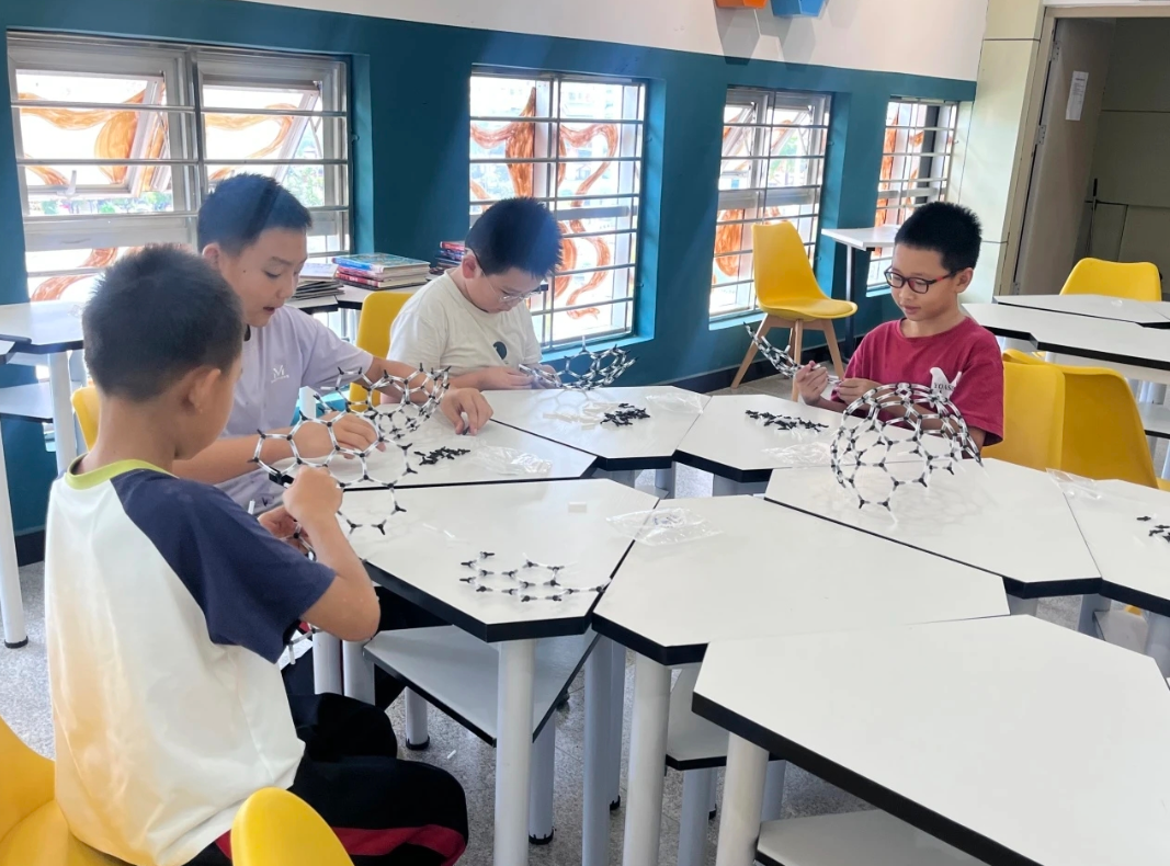 科技小制作探索分子奥秘。8月17日的碳60制作堪称 “化学版乐高”,孩子们用黑色软管,按照“五边形 六边形”的黄金组合,拼接出足球状的碳60分子模型,直观了解化学键与纳米材料的特性,激发对材料科学的兴趣。