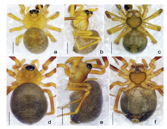 丹霞岳麓蛛新种(Yuelushannus danxia sp.nov.),雄性正模标本(a-c)与雌性副模标本(d-f)。(a,d)背面形态。(b,e)侧面形态。(c,e)腹部形态。比例尺:0.5毫米。