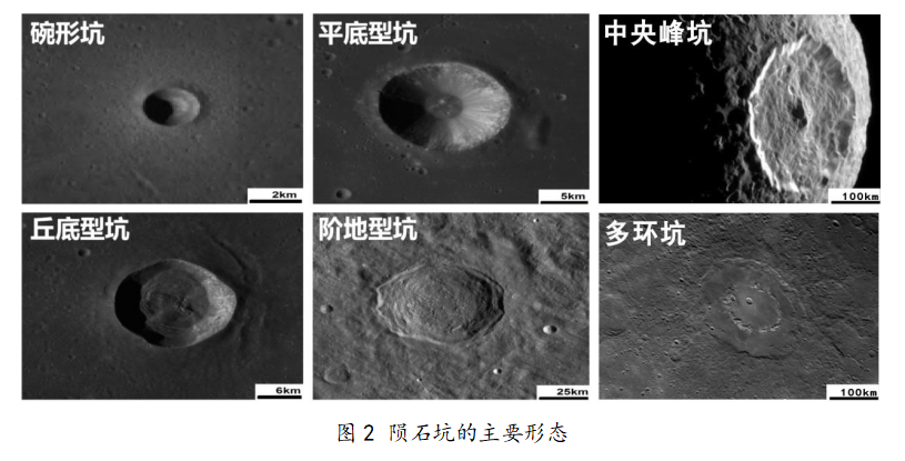 陨石坑也称撞击坑、陨击坑,形态上多呈圆形、或形成辐射状和环形构造的坑穴,少量呈椭圆形(图2)。
