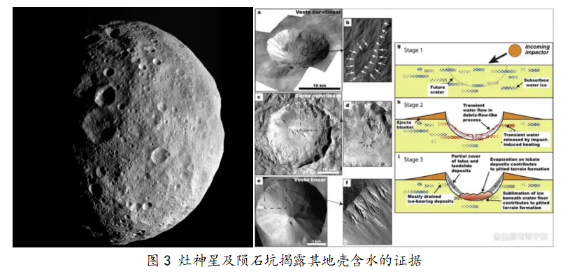 如灶神星这类未达到流体静力平衡的想土豆一样的小行星,他上面的一个陨石坑中发育了大量的流水冲刷痕迹,通过科学家模拟,这些痕迹是陨石撞击后融化了其地壳内含盐水冰形成的,表明诸如灶神星这类岩质小行星地壳内也是含水的(图3)。