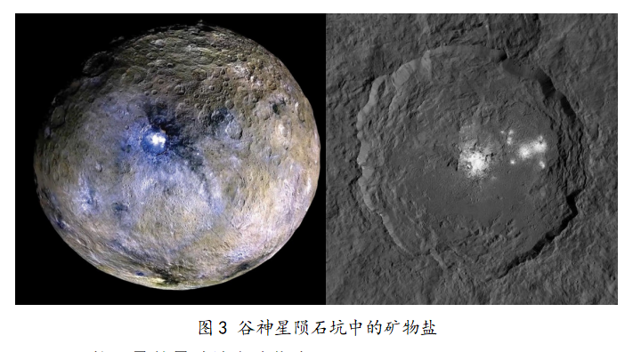 如谷神星上陨石坑里出现大量白色沉积物,那是水火山喷发后残留的矿物盐,表面谷神星地表之下可能存在液态水或液态海洋(图4)。