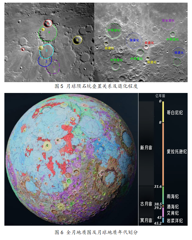 按照太阳系演化模型,小行星撞击事件频次会随时间逐渐减低,以月球为例,依据的规模及地层叠置关系、退化程度建立了陨石坑撞击坑及岩浆盆地的演化顺序(图5),完成了月球动力学演化的“三宙六纪”模型的建立(图6)。