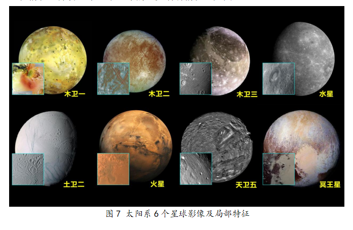 下面一张图,是太阳系中6个典型星球,大家可以根据陨石坑发育、叠置和退化情况,分析一下6个星球的地壳活动情况,见图7。