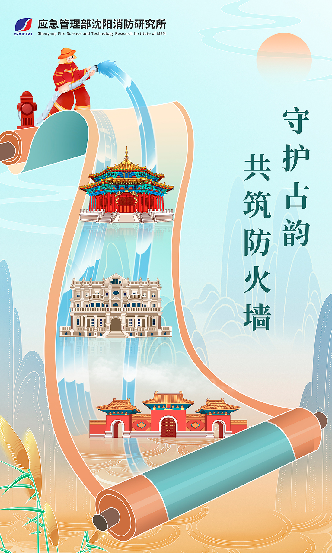 本海报旨在通过视觉艺术的形式,传递古建筑防火的重要性,将现代消防理念与沈阳地区丰富的历史文化遗产相结合,唤起公众对古建筑消防安全的关注与重视。海报设计以消防员作为守护者,为沈阳故宫、大帅府、北陵公园等标志性古建筑筑起坚实的防火墙,既展现了消防员在保护文化遗产中的重要作用,又凸显了防火工作的紧迫性和必要性。