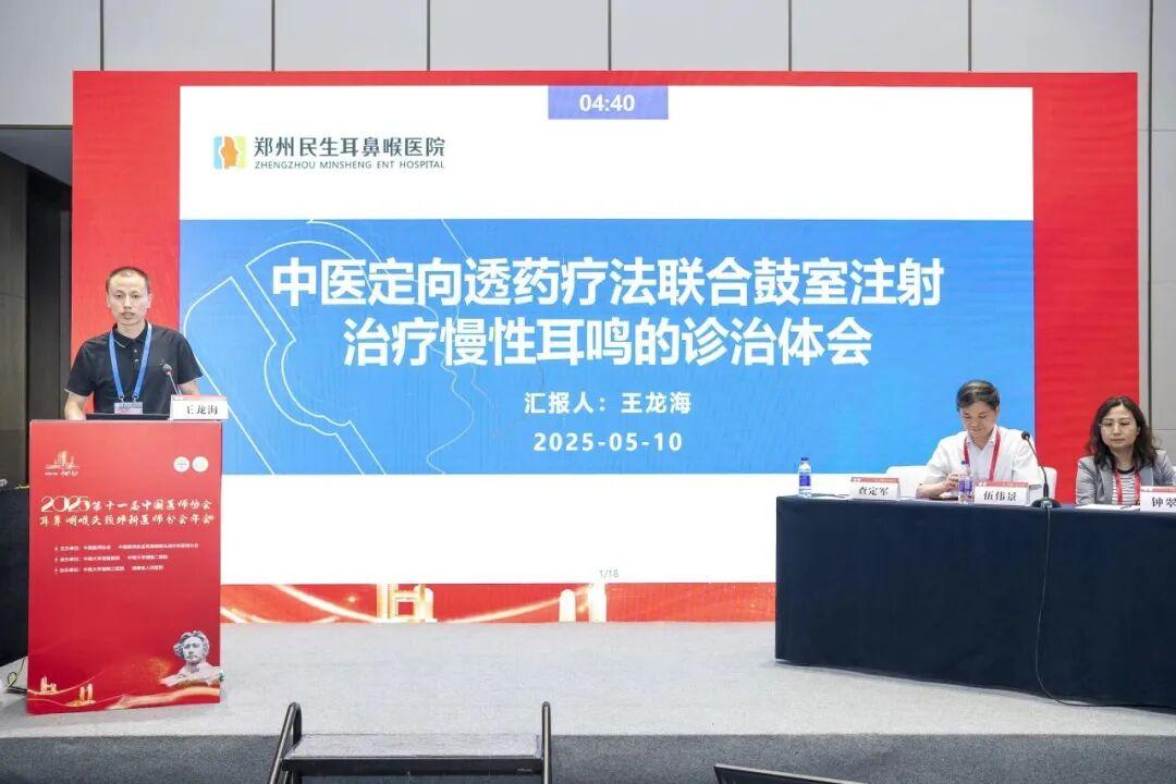 2025年5月,在中国医师协会耳鼻咽喉头颈外科年会上,我院耳科病区主任王龙海分享了《中医定向透药疗法联合鼓室注射治疗慢性耳鸣的诊治体会》。研究显示,该方案在120例顽固性耳鸣患者中综合有效率达80%,为中西医结合干预耳鸣提供了新的循证依据。