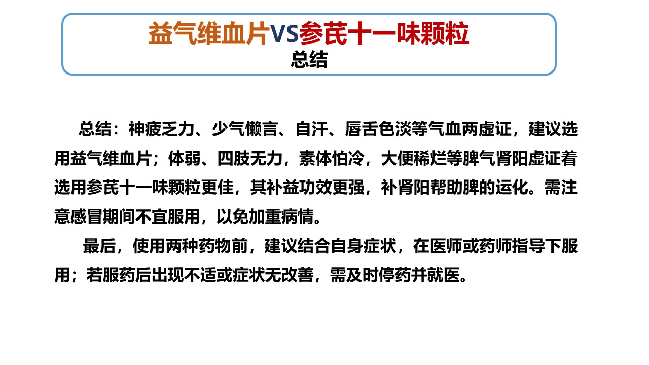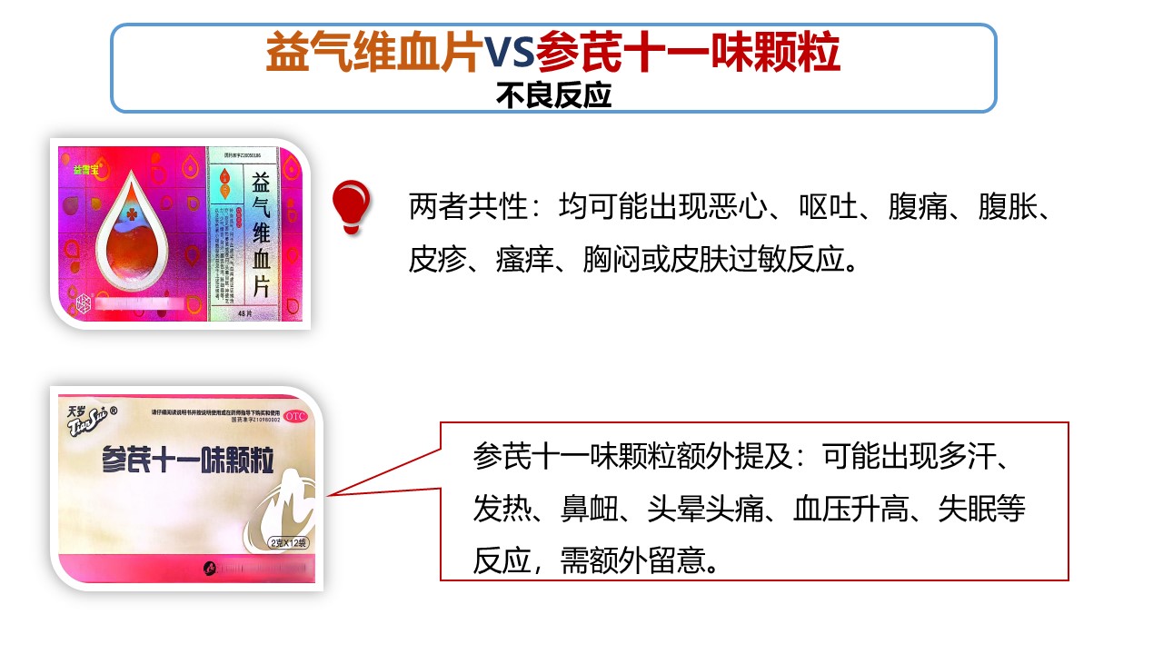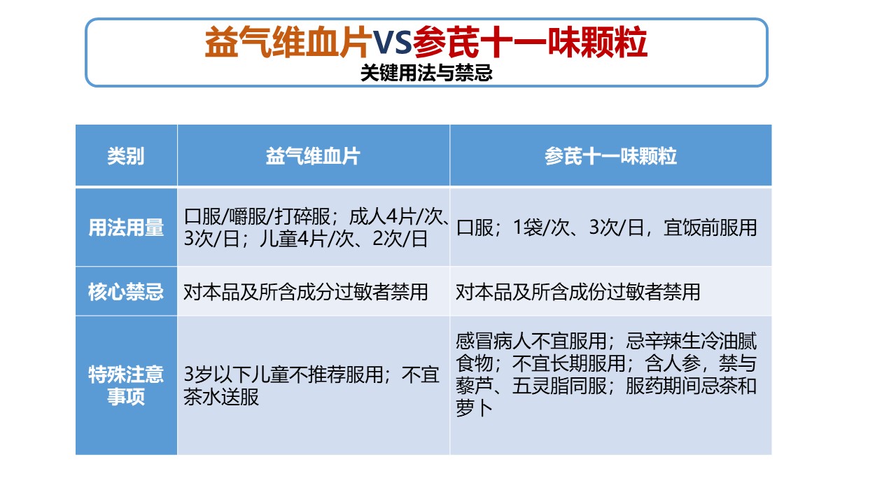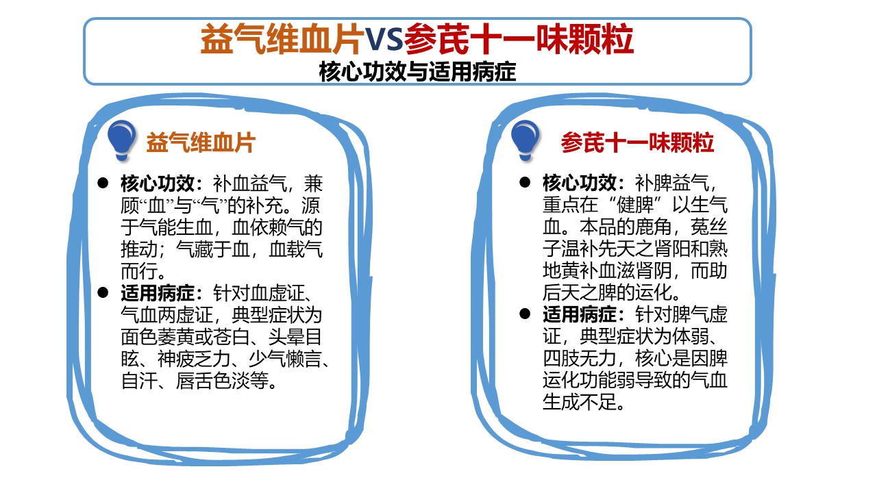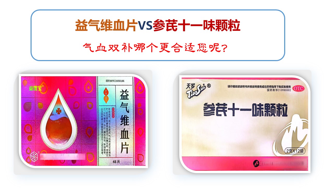 益气维血片由猪血提取物、黄芪、大枣组成。参芪十一味颗粒由人参(去芦)、黄芪、当归、天麻、熟地黄、泽泻、决明子、鹿角、菟丝子、细辛、枸杞子组成。共同含有黄芪补益脾气,两个又有何差别呢?