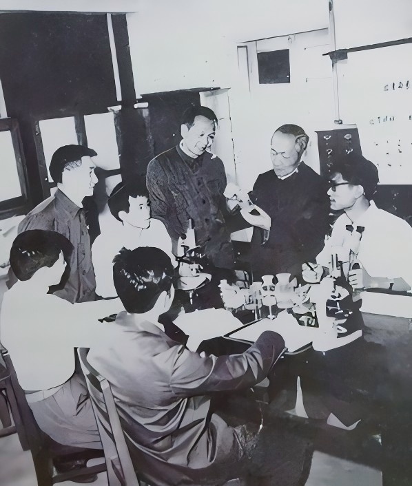 郑重教授(右2)指导中青年教师做实验