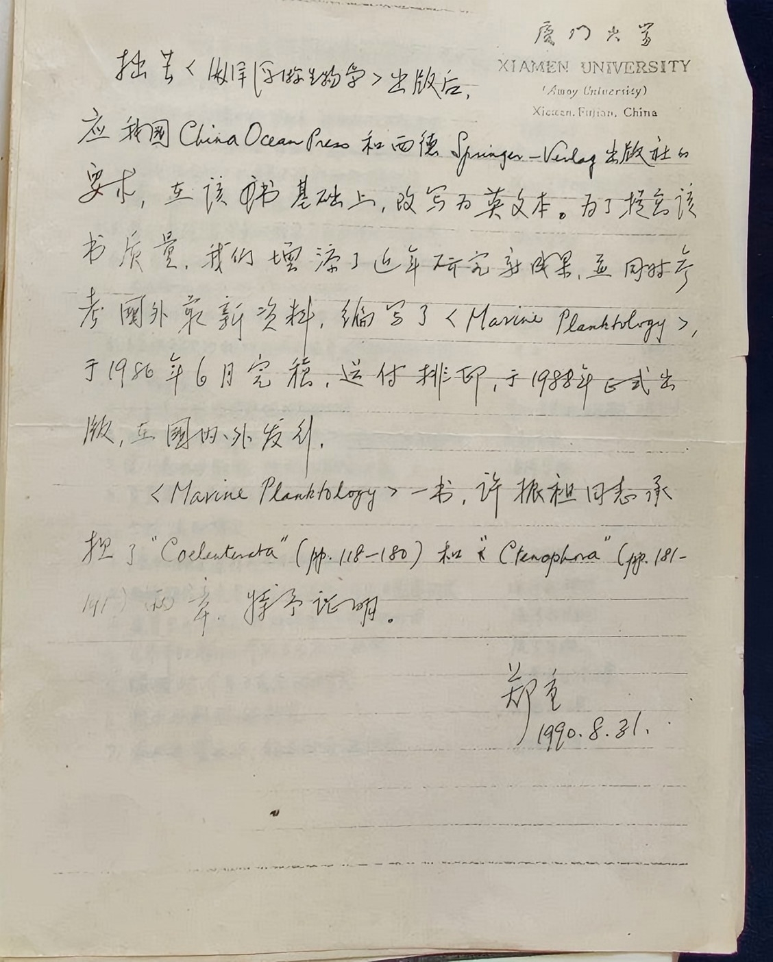 厦门大学"海洋浮游生物学"在国际上很有影响,学科创始人郑重教授是位值得敬仰的导师,他所领导的教学组在教学和科研方面都是最出色的,所出版的关于浮游生物学系列教材和参考资料对海洋浮游生物学科的发展贡献很大,尤其《海洋浮游生物学》更是一部难得的好教材,被日本广岛大学和东京水产大学的相关专业列为主要教学参考书。