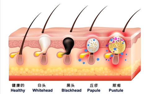 2.毛囊堵塞:毛囊皮脂腺导管口过度角化,形成角栓,堵塞毛囊口,使皮脂无法正常排出,为痤疮丙酸杆菌提供了丰富的营养来源。