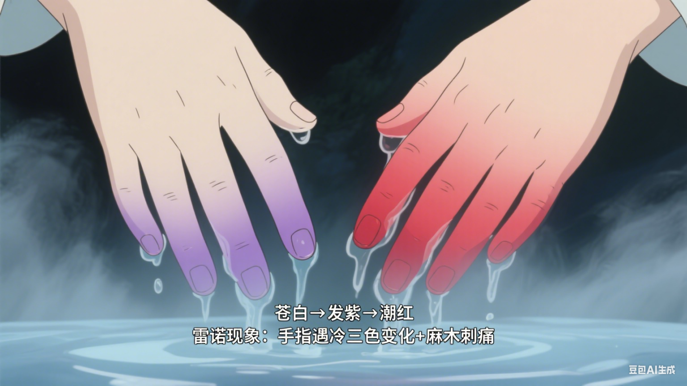 肢端症状(雷诺现象):手指、脚趾接触冷水或暴露在冷空气中后,会迅速出现 “苍白→发紫→潮红” 的三色变化,同时伴随麻木、刺痛、发凉,温暖后几分钟到几小时才能逐渐缓解。严重时,手指末端可能因血管堵塞出现溃疡、甚至组织坏死。