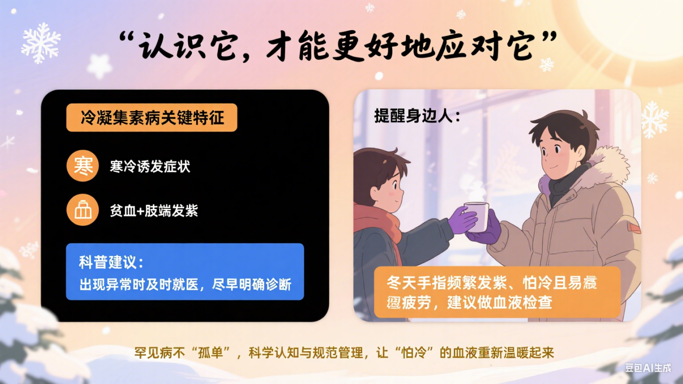 对患者而言,除了医疗干预,心态调整也很重要:不必因 “罕见” 而焦虑,可通过加入罕见病患者社群(如中国罕见病联盟),与其他患者交流经验;同时定期随访血液科医生,根据病情变化调整治疗方案,避免因忽视保暖或漏服药物导致病情加重。