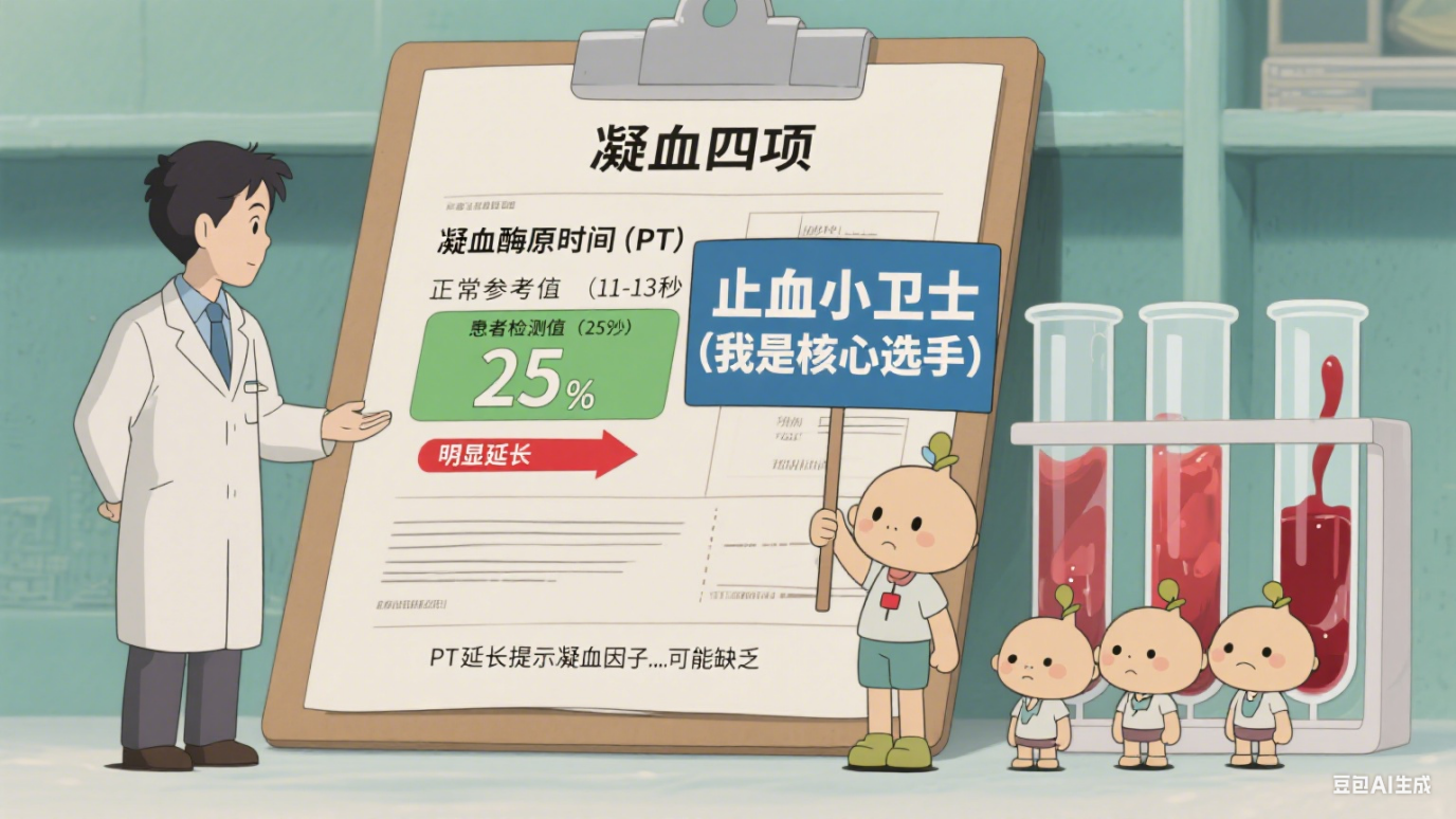 医生会先让做 “凝血四项” 检查,其中 “凝血酶原时间(PT)” 是最关键的指标 —— 凝血因子 Ⅶ 是参与 PT 检测的 “核心选手”,如果 PT 明显延长(比如正常参考值是 11-13 秒,患者可能会达到 20 秒以上),就提示可能存在凝血因子 Ⅶ 缺乏的问题。