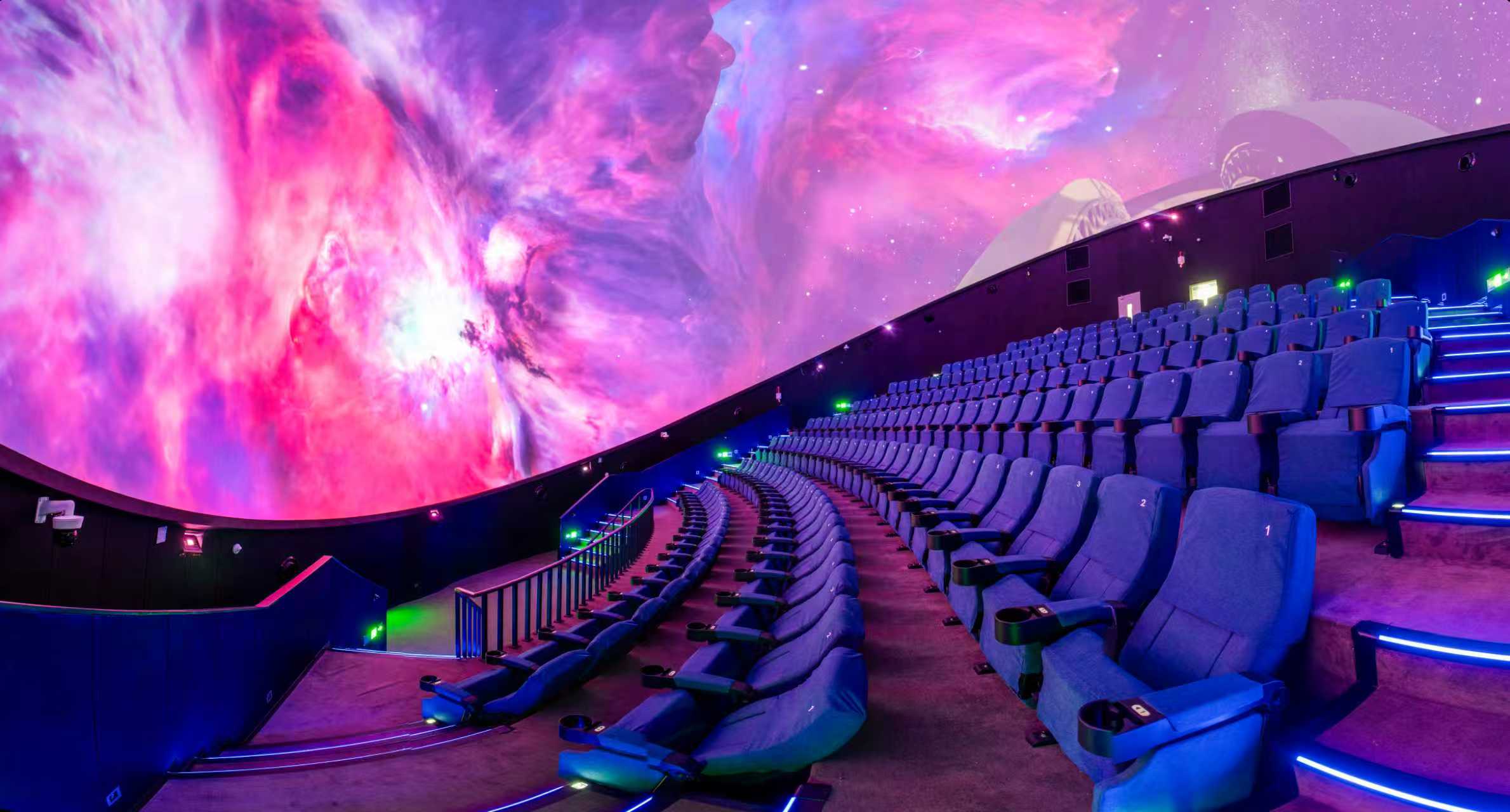 安徽省科技馆球幕影院的建设,秉承“国际一流、国内领先”的建馆目标,引进全球先进的Digistar 7播放系统,其投影系统总亮度高达50万流明,位居国内科普场馆球幕影院之首。影院位于展厅二层,采用内径近22米、180度双曲成形的金属透声银幕,结合现代化投影融合技术和10台RGB激光工程投影机,可呈现真8K分辨率的高沉浸感球幕影像,创造出超大、无缝且逼真的画面效果。银幕呈半球状,倾斜23度,将观众完全包围其中,并设有183个座位(含2个残疾人专座)。影院还搭载7.1声道数字环绕音响系统,可实时生成多声道音频,进一步增强环境沉浸感,为观众带来强烈的视听震撼与无与伦比的艺术享受。