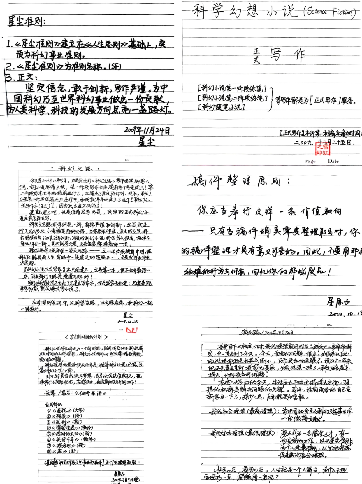 指尖抚过泛黄纸页,十六年时光的重量沉甸甸地落在掌心。2009年的春日,高中时代的我第一次熬夜提笔,开始了科幻写作的漫漫练笔路,从基础练笔、文采练笔到综合练笔,笨拙地一层层垒砌想象的基石。人生过得太快了,恍惚间,竟已十六年。不过在那2012年的夏天,看着三年心血化为灰烬,挫败感差点淹没了所有坚持。那些在19岁时于宿舍走廊烧掉的各种手稿资料,当时拍下的照片如今像素低、越发模糊,却成了那段时光仅存的印记。