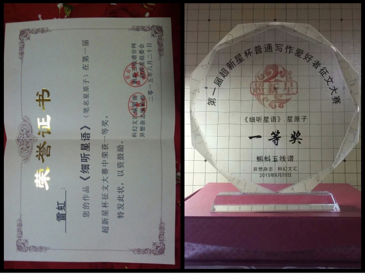 技术处理后,我看些那些手稿文字,当年那些我所定下的计划、我所立下的誓言,不禁感慨:看起来,我已经全部达成了。在那个烧稿之后的七月,我与合肥的秦恩锦并肩创立“新尘科幻创作组”,如同在废墟里重新点亮了星火——团队后来渐成规模,《新尘科幻》电子杂志应运而生。同年深秋与初冬,笔名“星原子”下的短篇《警察境遇》和短篇《如此艺术》相继刊出,一篇《林中小屋》的影评也随之流淌。而进高三前写的短篇《释爱》习作,竟意外收获了首届全国大学生“科联奖”的优秀作品奖,像一颗微弱的启明星,悄然预示前路。