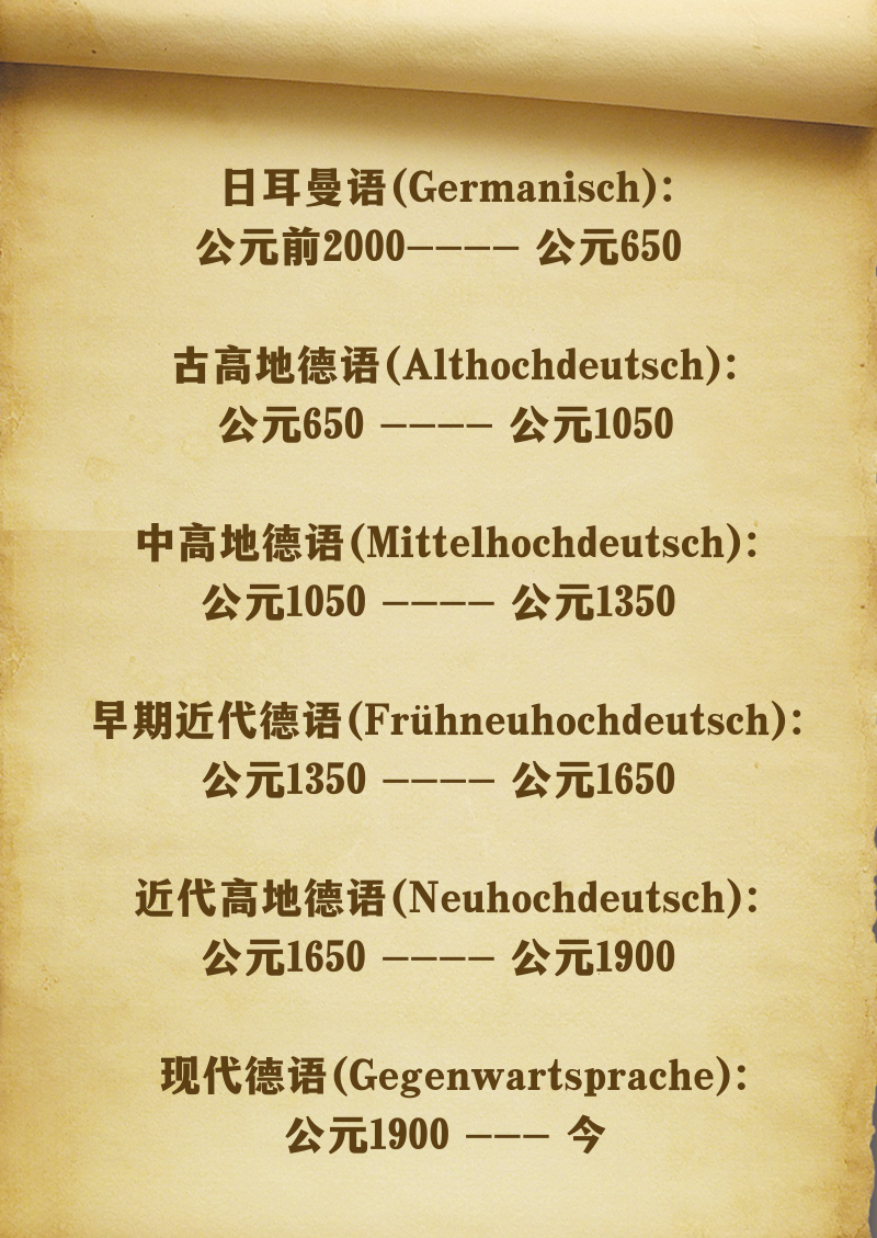 德语语言学家将德语发展史划分为以下几个阶段: