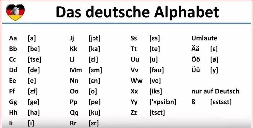 其中 Aa、Ee、Ii、Oo、Uu 以及三个变体字母 Ää、Öö、Üü 为元音字母。包括 ß 的其它字母为辅音字母。