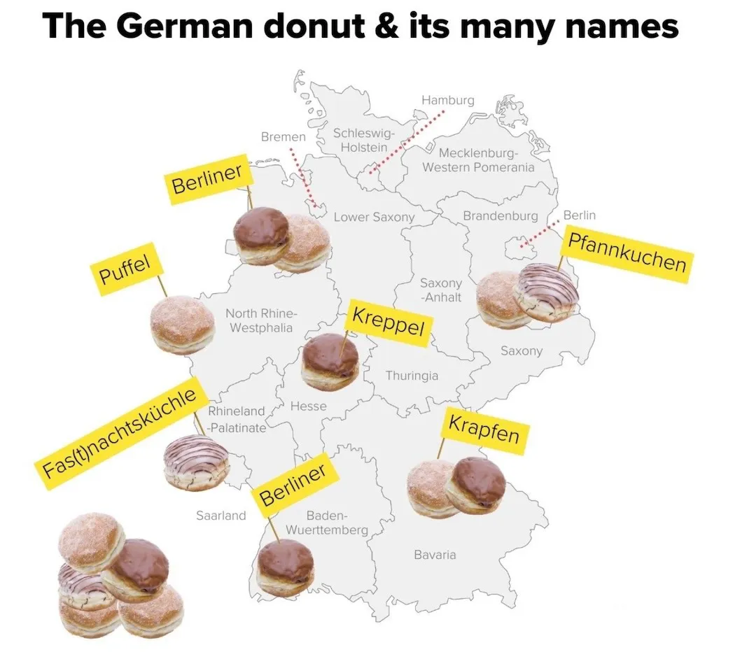 研究人员把德国的方言归纳为16个较大的方言群。德国西南部说的是阿勒曼尼克话(“schwätzt”),北边讲黑森话(“babbeln”),汉堡人开口则是在“schnacken”。当然,方言不仅仅只拥有自己的词汇,它还自成一种语言体系,具有自己的规则和独特的语音语调。“方言”这个概念源自希腊语,意为“群体的对话与说话方式”。在下面这张图中我们就能直观地感受到,甜甜圈在德国不同的地区都有其专属名称。