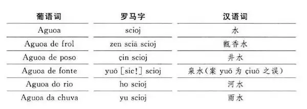 罗马耶稣会档案馆曾发现一部著于1584—1588年间的未完稿的葡华词典抄本,中文名为《平常问答词意》,乃罗明坚和利玛窦合著,附有罗马注音,语言学界一般称之为《葡汉辞典》。辞典手稿分三栏:第一栏为葡语词目,有6000多条,按ABC顺序排列;第二栏是用罗马字拼写的汉语对应词;第三栏是用汉字书写的汉语对应词。 如: